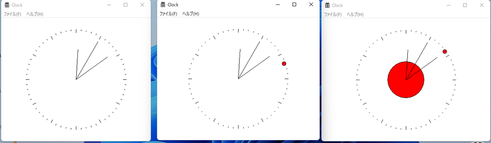 sin,cosの応用ということで、アナログ時計の表示ということを考えてみました。ついでに、予定時刻にマークを入れておいて、その時刻になると中央に赤丸を表示するという機能を作ってみました。さて、本題のアナログ時計を作ってみようという工作みたいな話ですが、何か図形を選択して針にするということになると思いますが、さっぱりアイデアが思いつかないので、とりあえず細線だけの試作品を出してみて要望がありそうなら考えようということになりました。ははは。
